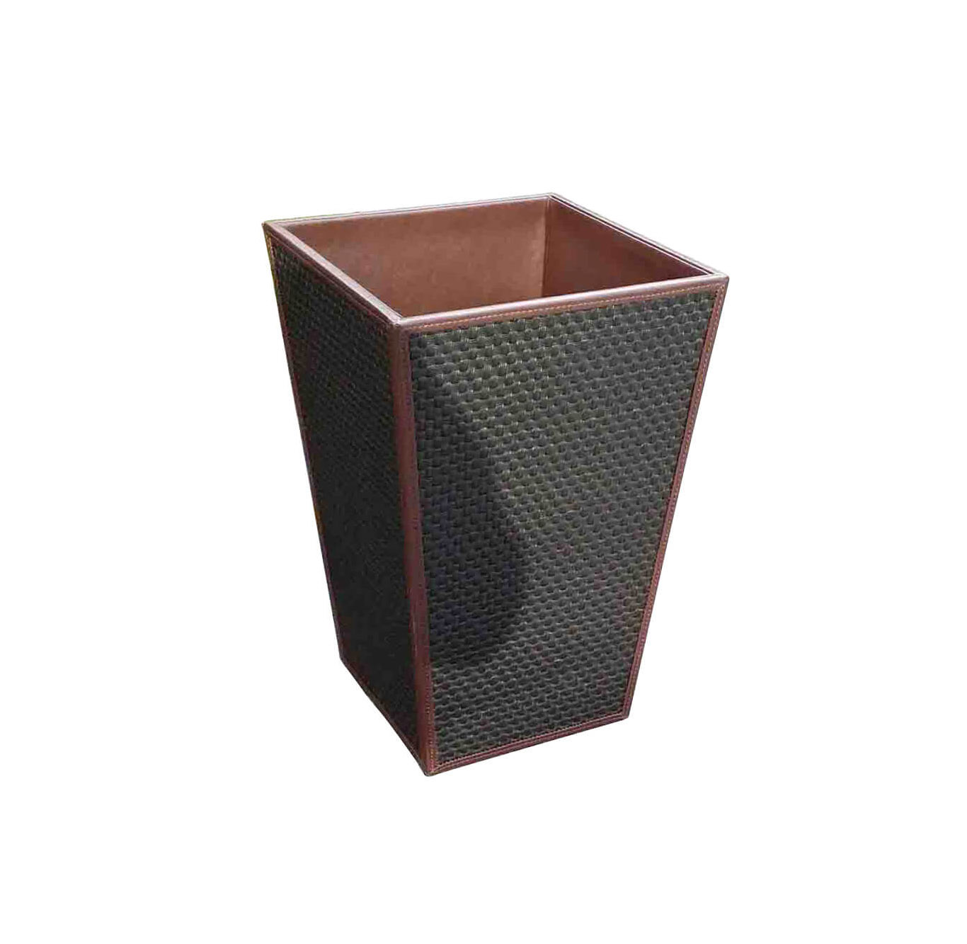 Our custom-manufactured leather trash can is crafted with imitation leather featuring a woven pattern and meticulous coffee stitching. The square-shaped leather waste basket measures 8.7″ × 8.7″ × 13.4″ (upper edge) and weighs 1.43 kg, providing a sturdy yet portable solution. The interior and exterior surfaces are wipe-clean and stain-resistant, while the felt underside protects floors. The design accommodates a metal trash can liner or direct disposal for flexible use.