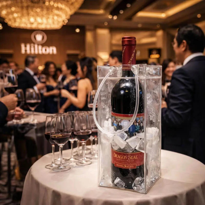 This plastic ice bag for wine is commonly customized for hotel groups, beverage brands, importers, and promotional product distributors.