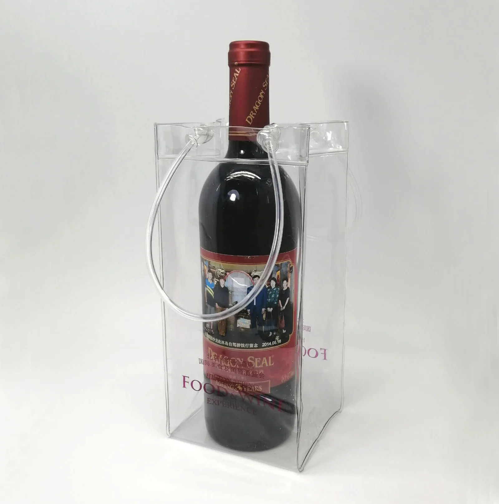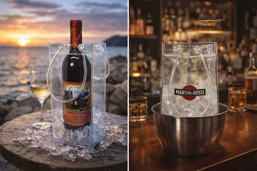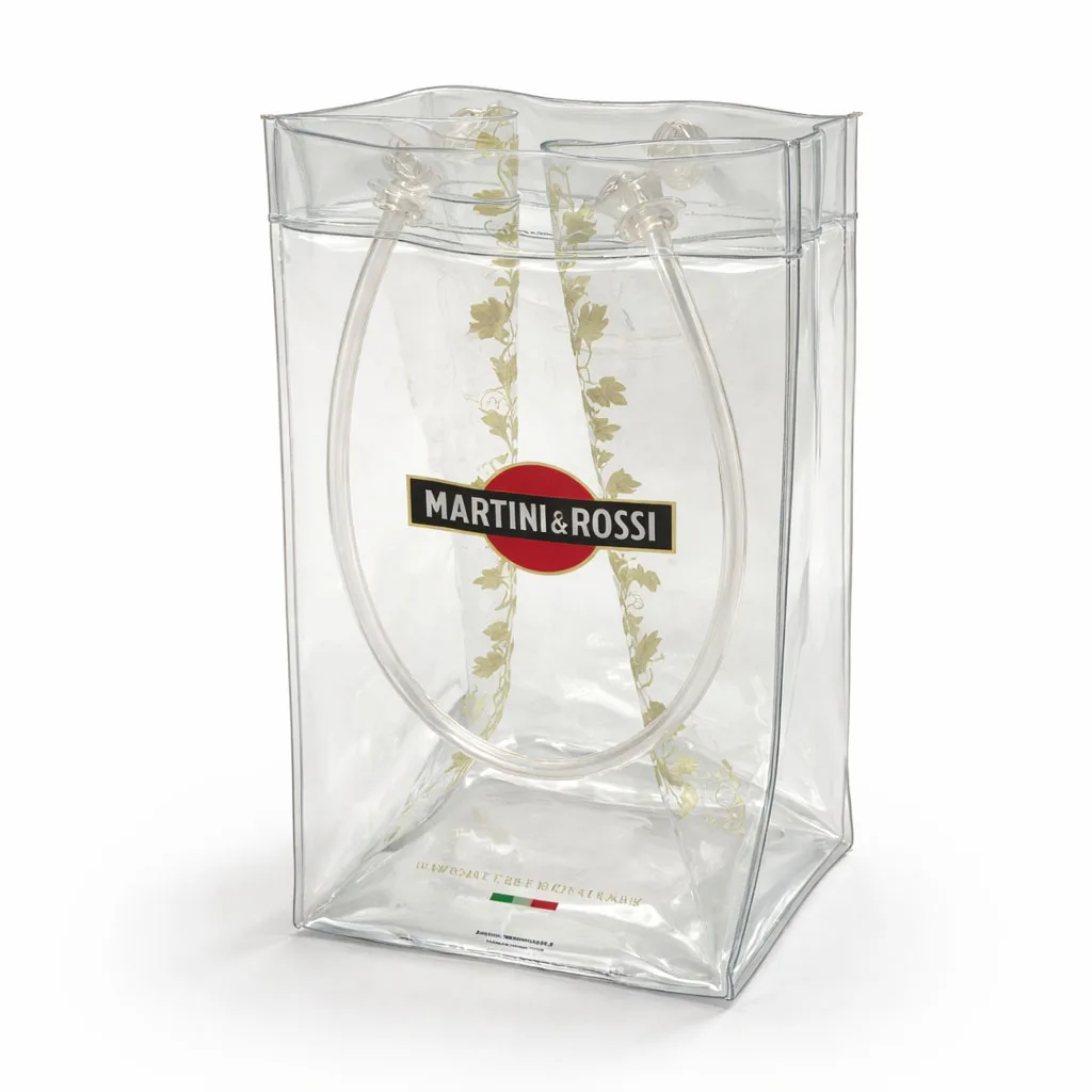 Manufactured from durable transparent PVC, this product functions as a practical cooler bag for wine while maintaining clear visibility of the bottle and ice. As a plastic ice bag for wine, it is widely used in hotels, beverage promotions, events, and hospitality supply projects.
