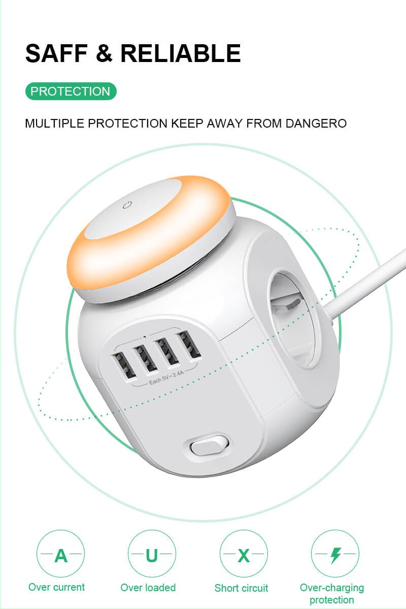 | Product Name: | Versatile EU Extension Socket with 4 USB Charging Ports – Your Portable Power Cube Companion with a Night Light | Function: | Electrical outlet connection + separable night light | Rated Current: | 15 A |