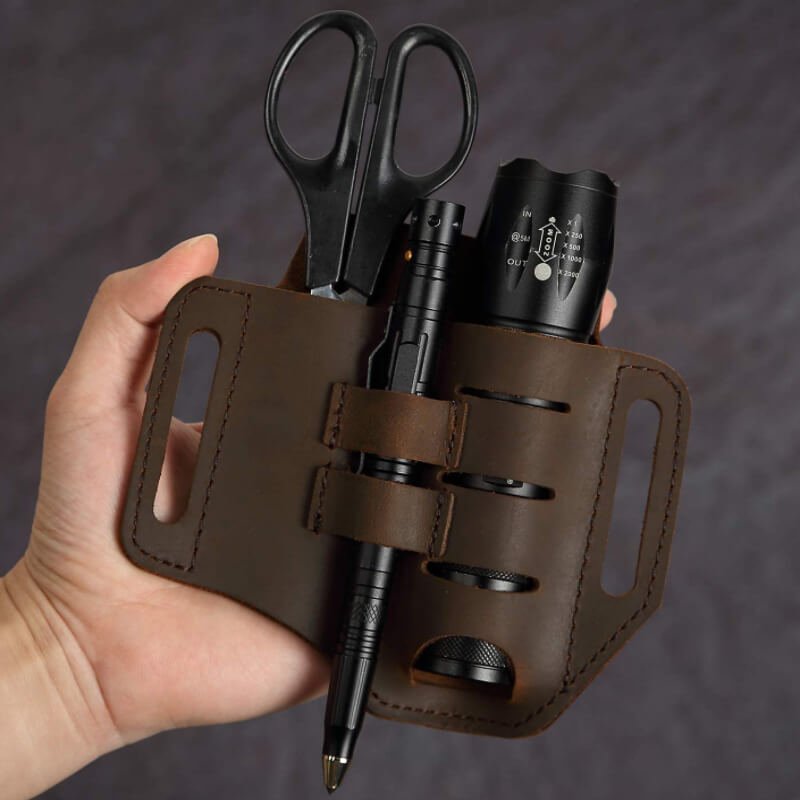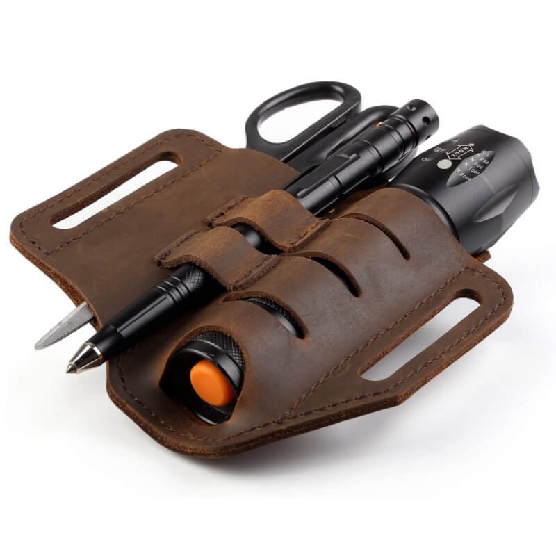 - EDC leather sheath with multiple pockets for knives, flashlights, tactical pens
