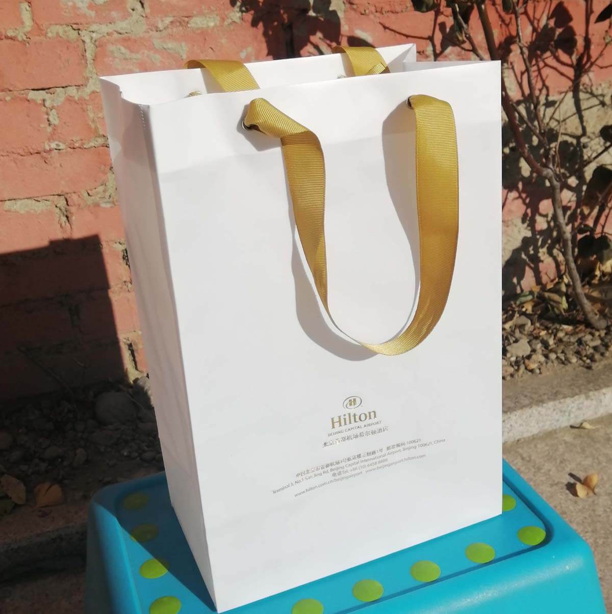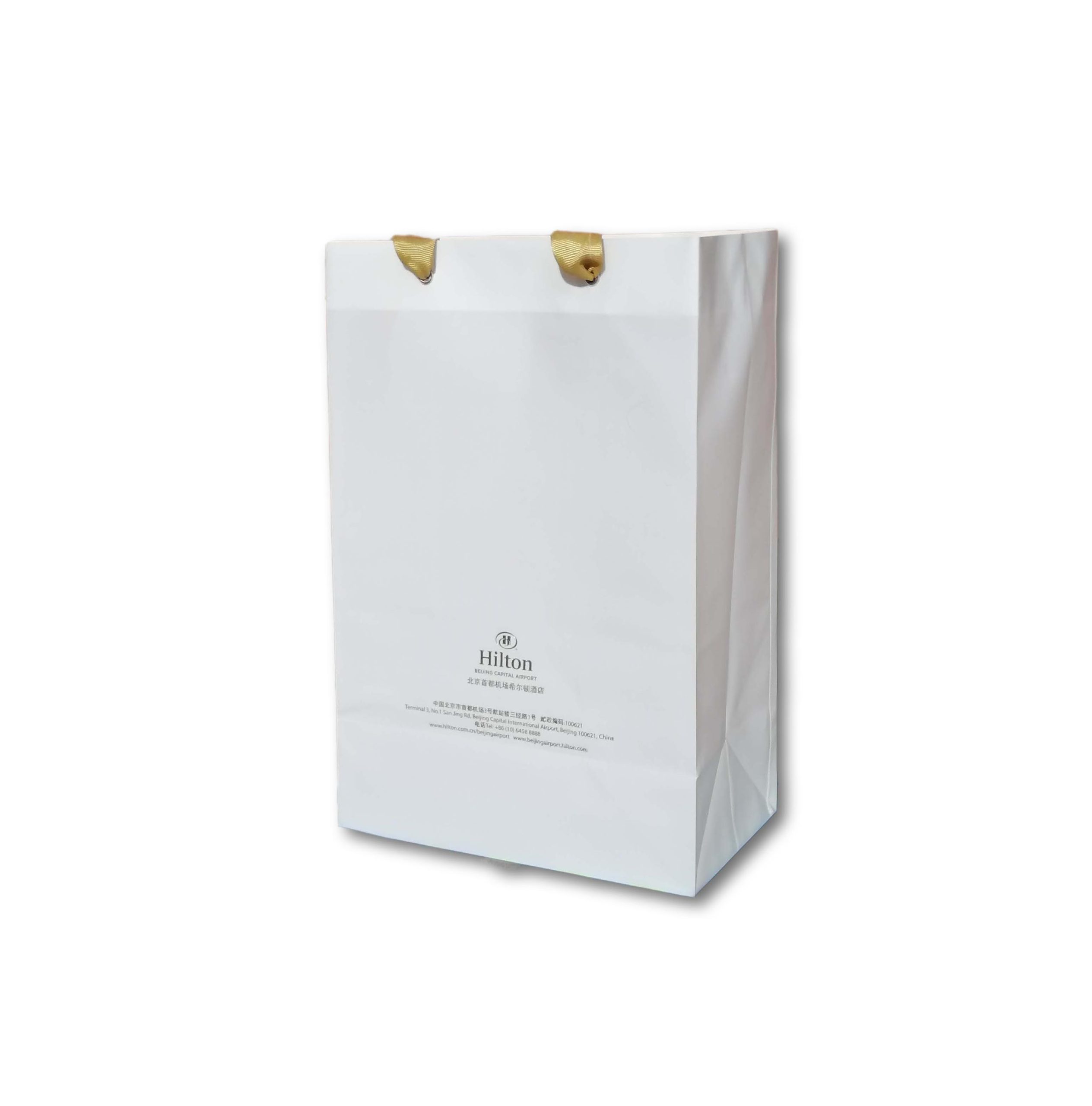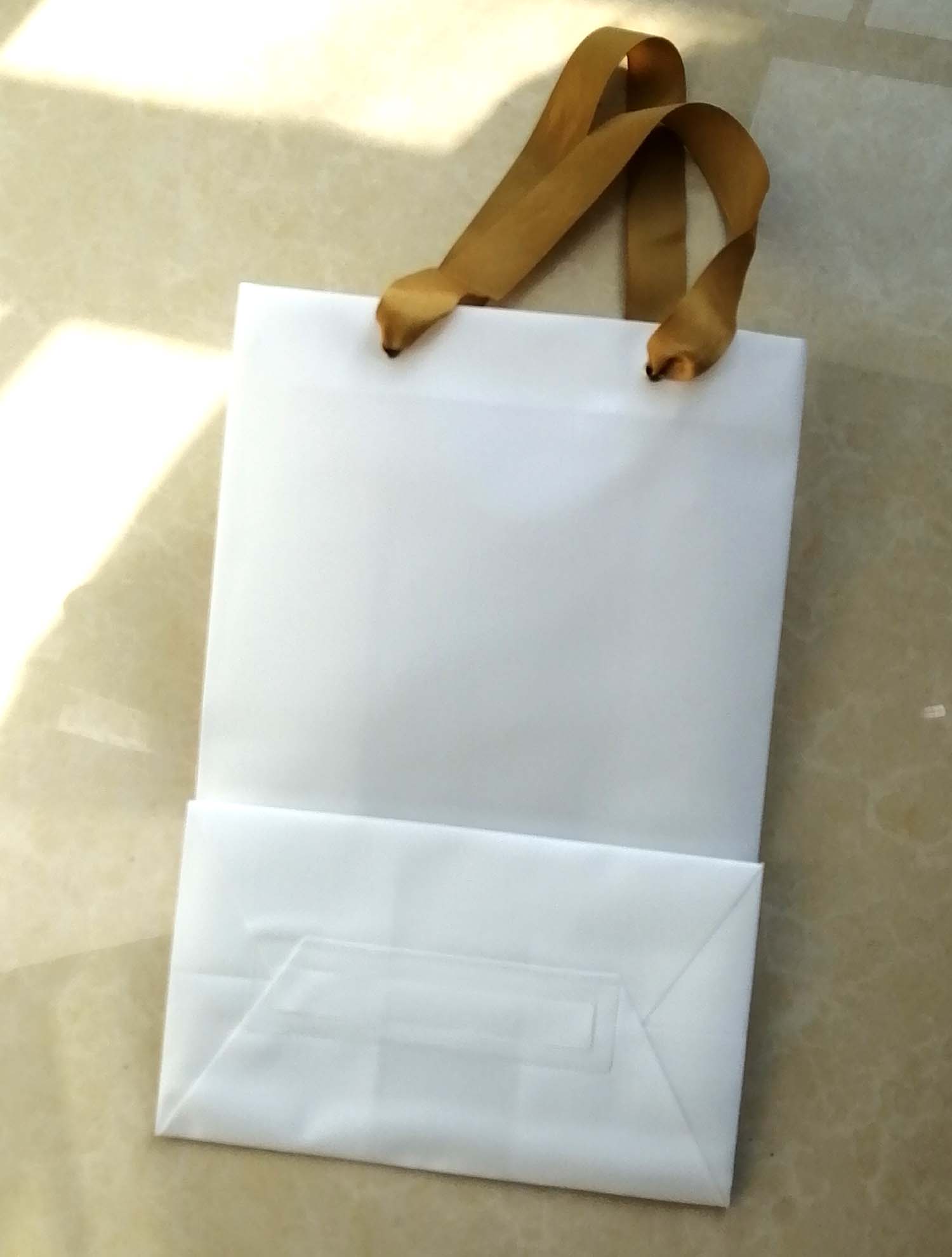 - Medium-sized bags with a hard board bottom and sturdy golden ribbon handle